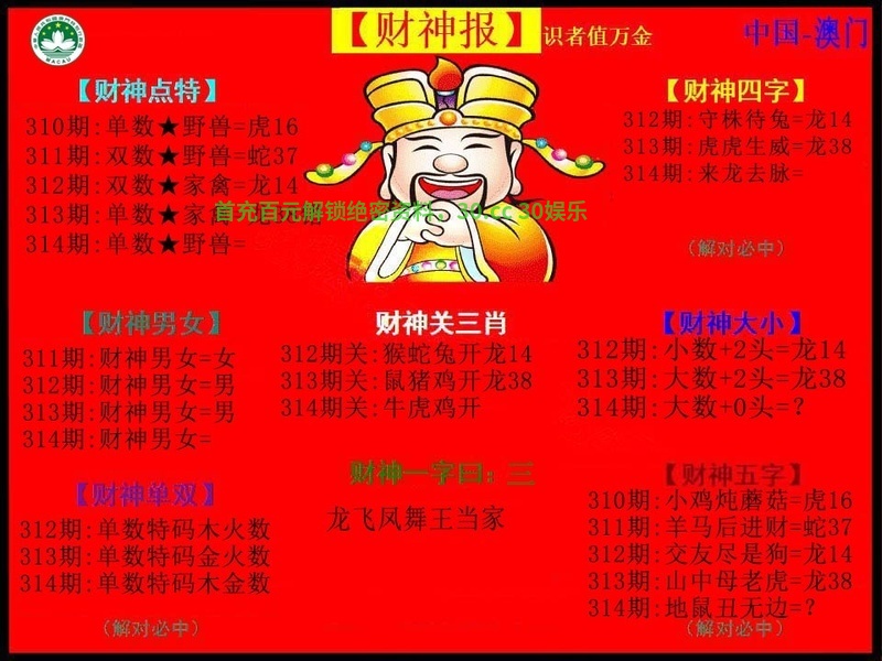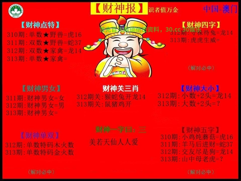 | 314期:【前后四肖】开:羊23错 前【鼠龙虎牛】后【马猴猪鸡】 |